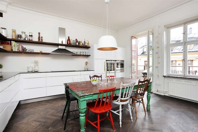 Базовый и минималистичный стол в обеденной зоне можно выгодно скрасить тремя-четырьмя стульями, отличающимися по моделям и цветам исполнения – такое разнообразие, выдержанное в одной концепции, мгновенно придаст помещению уникальный стиль, а сама задумка позволит подобрать удобную для каждого члена семьи модель.