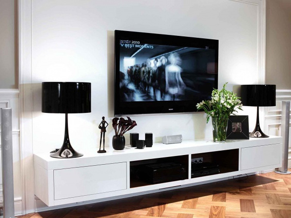 Для размещения техники существует большое количество вариантов: их подвешивают к стенам, крепят к потолку или устанавливают на специальные тумбы.