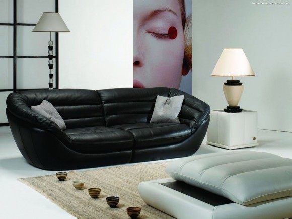 Например, черный кожаный диван, дополненный яркими подушками изыскано дополнит интерьер гостиной.