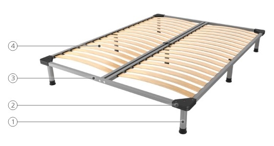 Основание состоит из металлического контура прямоугольной формы(3) с ортопедической решеткой из ламелей(4) внутри.