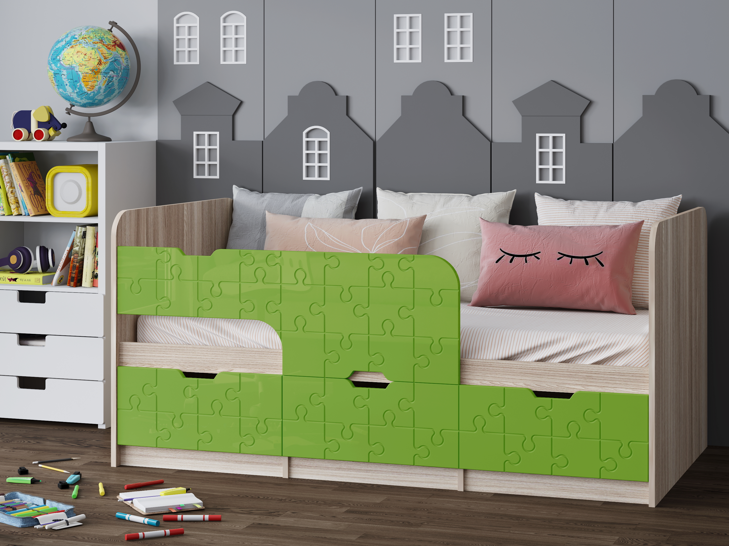 Кровать детская "Юниор-9" 0,8*1,8 м - Цитрус глянец / Ясень шимо светлый (левый)