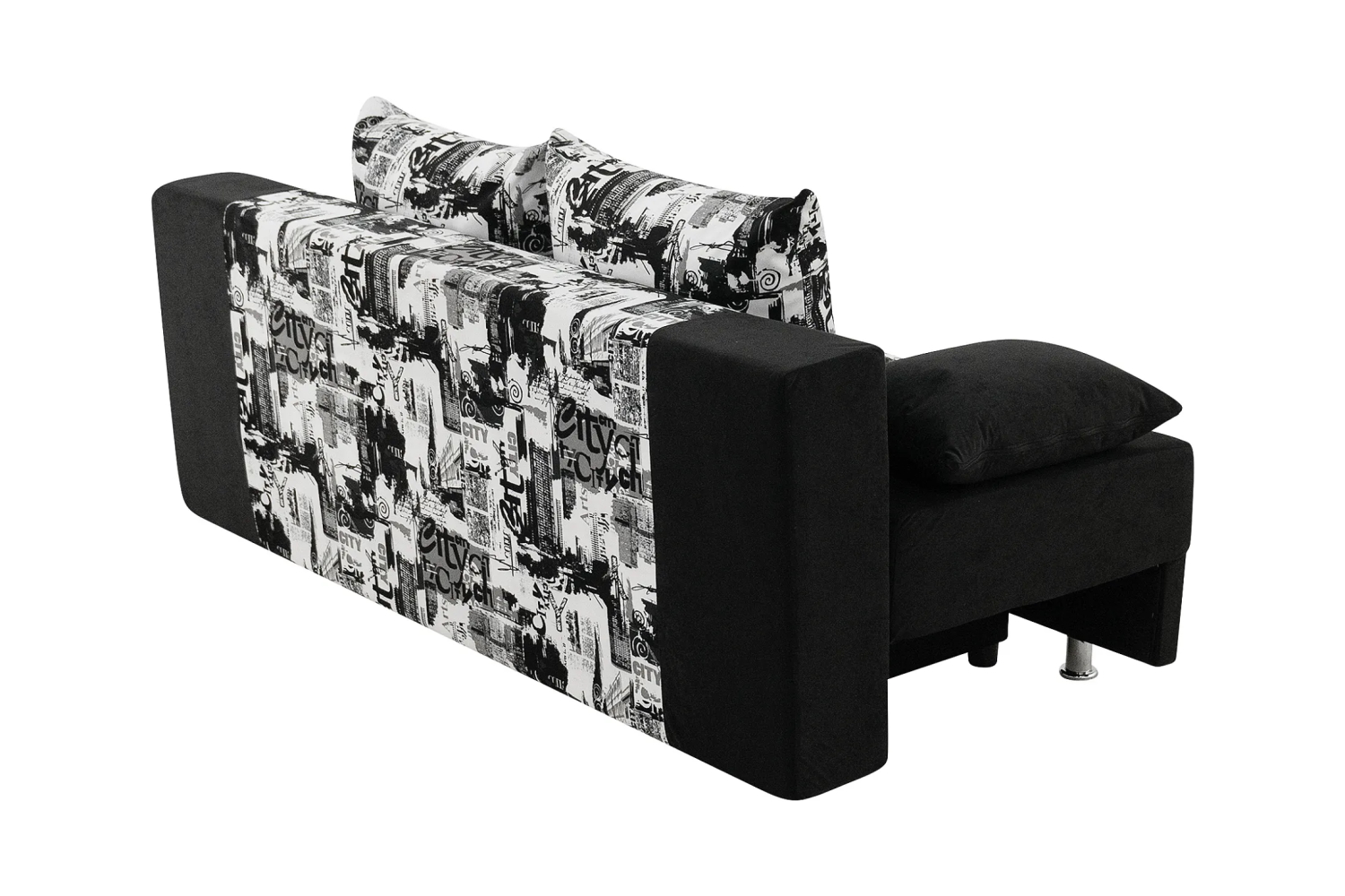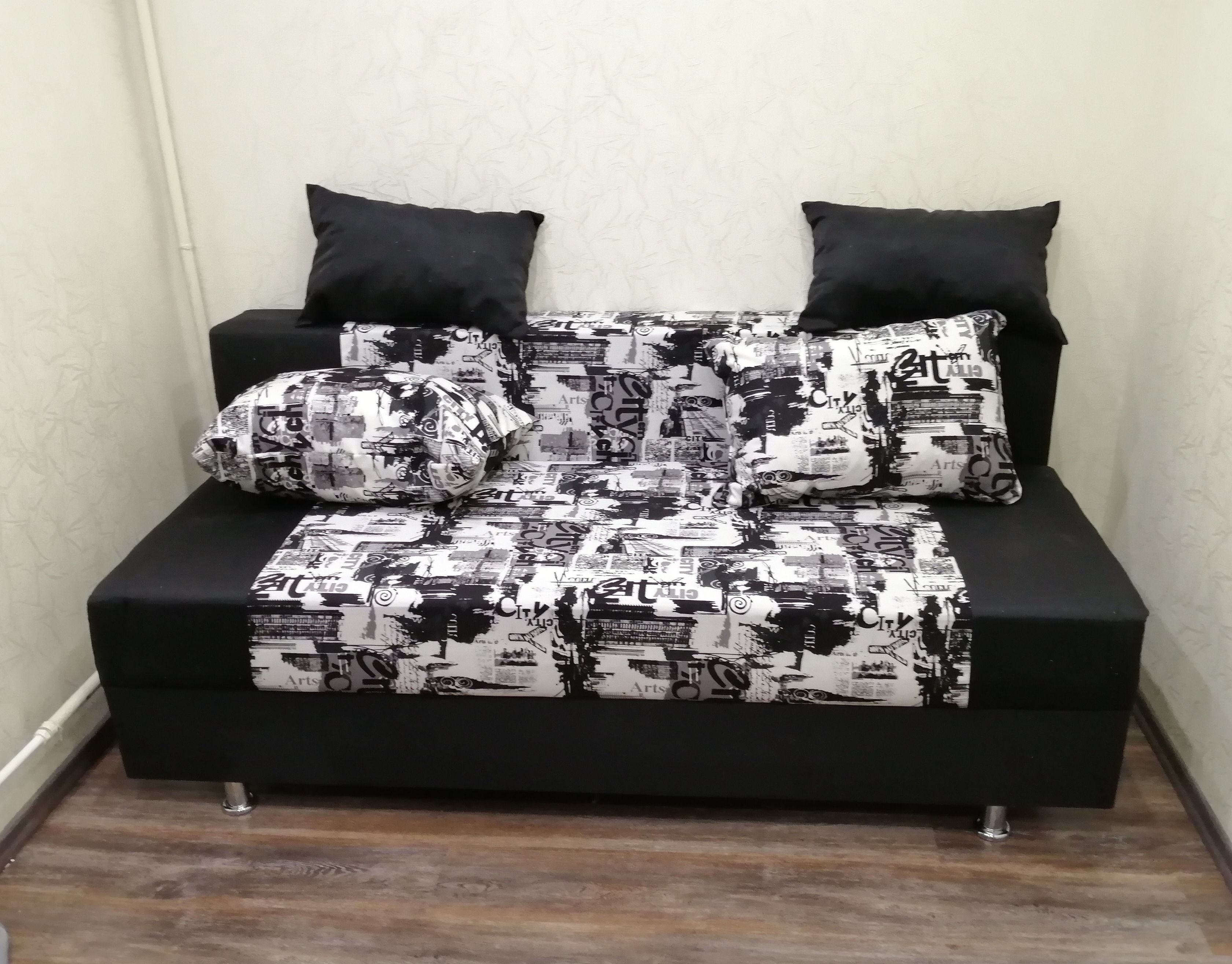 Обивка выполнена из микровелюра в сером, черном, черно-белом, разноцветном цвете. Для наполнителя применили зависимый пружинный блок.