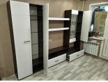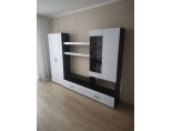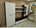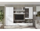 Тумба состоит из секции с двумя выдвижными ящиками, открытой ниши шириной 1200 мм, разделенной пополам вертикальной перегородкой и надстройкой. Надстройка в свою очередь состоит из секции со створками (правая глухая, левая со стеклом) и открытой ниши (ШхВхГ) 768х387х330 мм. В секции со створками устанавливаются две съемных полки. Шкаф с левой стороны комплектуется двумя распашными створками. В шкафу устанавливаются две стационарных полки, сверху и снизу и выдвижная евроштанга. Между шкафом и надстройкой располагаются две полки 1200х250 мм с фасадами из МДФ «Белый глянец».