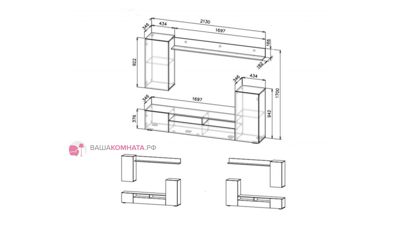 Комплект состоит из тумбы, навесного пенала и навесной полки. Габариты комплекта ШхВхГ 2130х1700х346 мм. В таком виде как на изображении размеры ниши под ТВ составляют 1244х1178 мм. Изделие можно собрать зеркально.