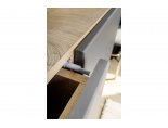 Тумба имеет две глухих двери по бокам, три выдвижных ящика в центральной части, дно ящиков выполнено из ЛДВП в цвет корпуса.