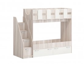 Двухъярусная кровать Мийа с двумя вместительными ящиками сочетает в себе удобство и функциональность. Она украсит интерьер и обязательно понравится детям. Кровать обладает универсальным цветом, поэтому понравится как девочкам, так и мальчикам. Удобная лестница и перегородка на верхнем спальном месте обеспечит безопасность и комфорт.
