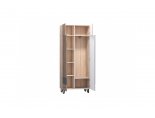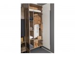 Верху большая стационарная полка. Левая секция комплектуется 4 полками, правая - штангой для одежды и полкой.
