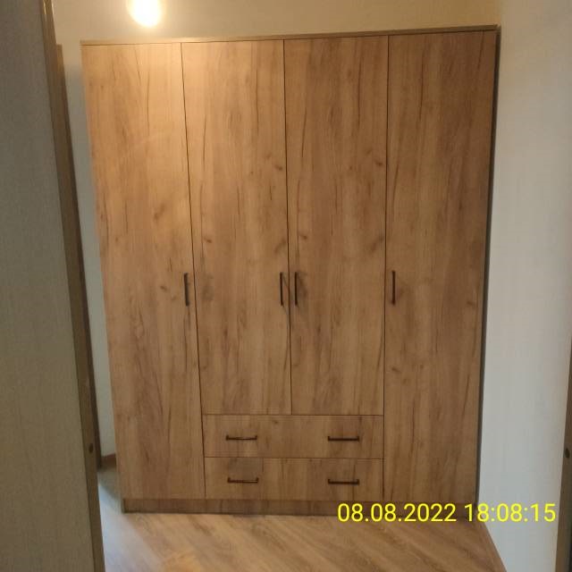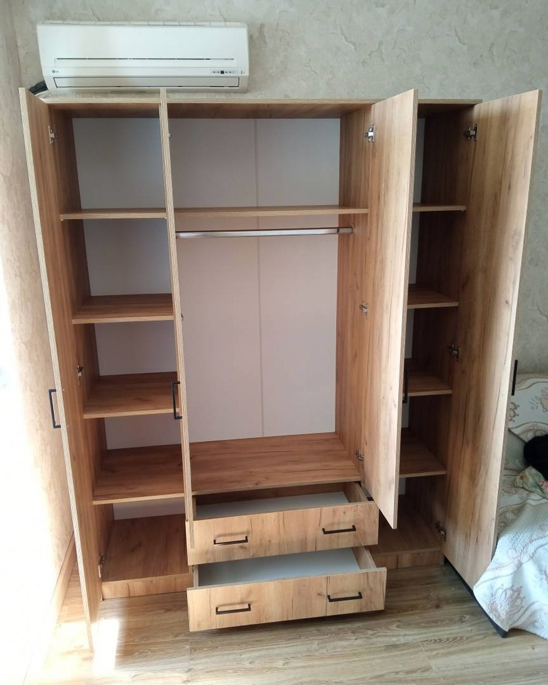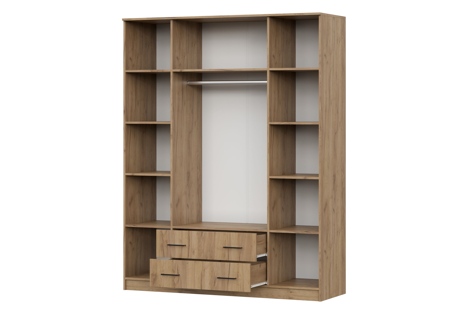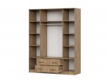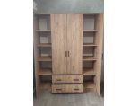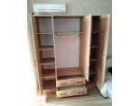 Шкаф комплектуется распашными створками и разделен вертикальными перегородками на 3 отделения. По краям располагаются бельевые отделения шириной 384 мм. В каждой из них устанавливается по четыре полки. Посередине отделение шириной 768 мм. В нижней части отделения расположена секция с двумя выдвижными ящиками, в верхней - платяное отделение высотой 1512 мм с одной полкой сверху и металлической штангой.
