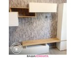 - Усиленная врезная столешница толщиной 32 мм частично уходит в шкаф, за счет этого она выполняет - сразу две роли: подставка под ТВ и полка шкафа